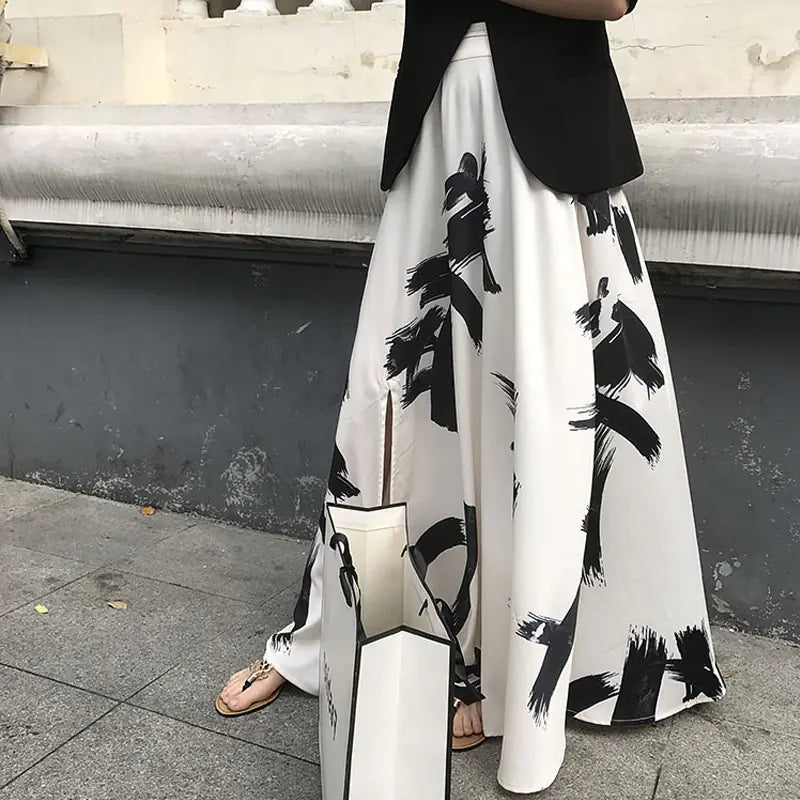 New Split Ink Print Chiffon Mid-Length Skirt